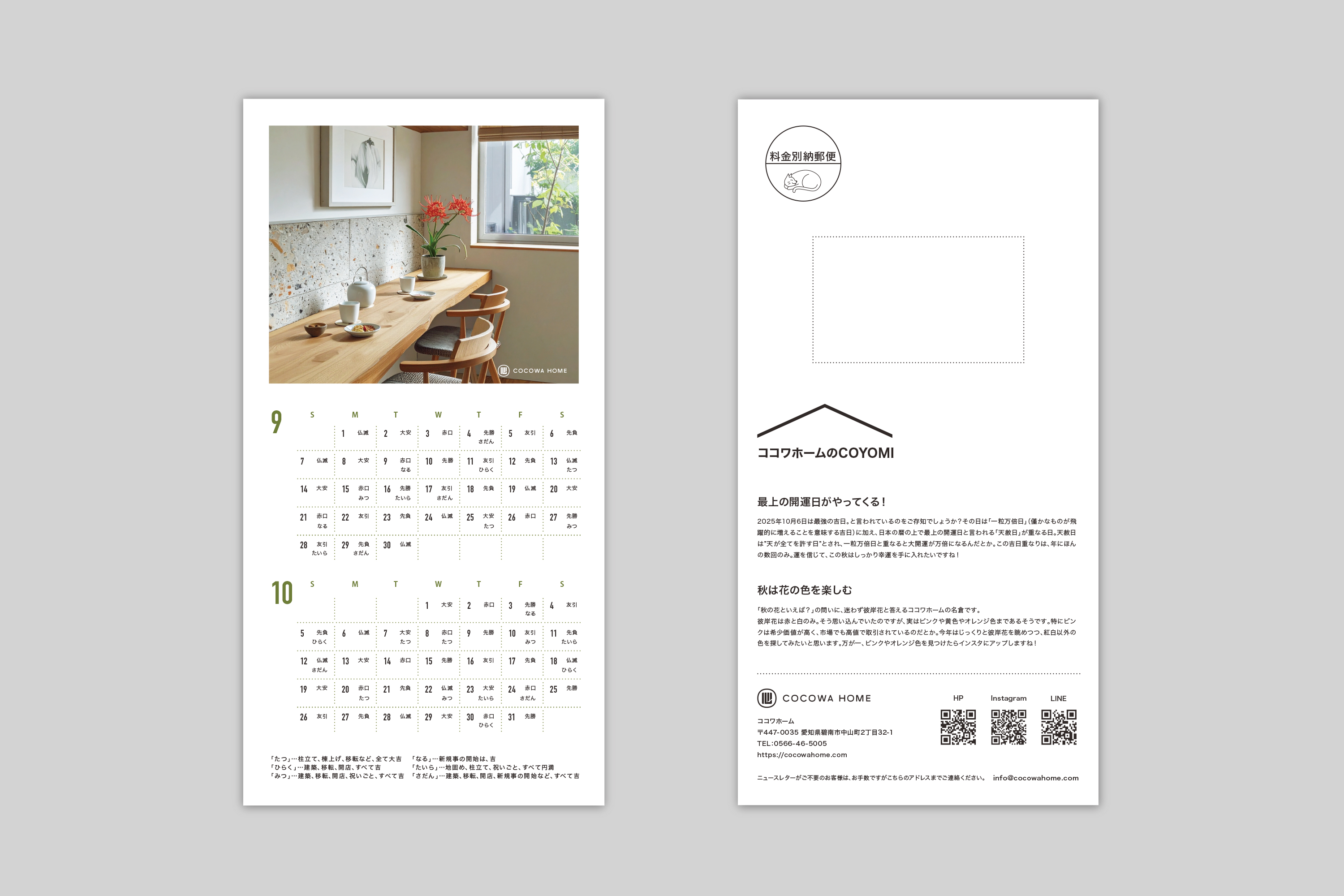 Cocowa home CL:Cocowa home(碧南市) ニュースレター Cocowa home様のニュースレターを制作しました。表面は、風合いのある落ち着いた雰囲気の室内と目を引く秋の彼岸花をメインビジュアルに。裏面の、暮らしを豊かにする「ココワホームのKOYOMI」の記事(季節の行事・節気の情報)制作も担当しています。 instagram @Cocowahome facebook Cocowa-home HP https://www.cocowahome.com/