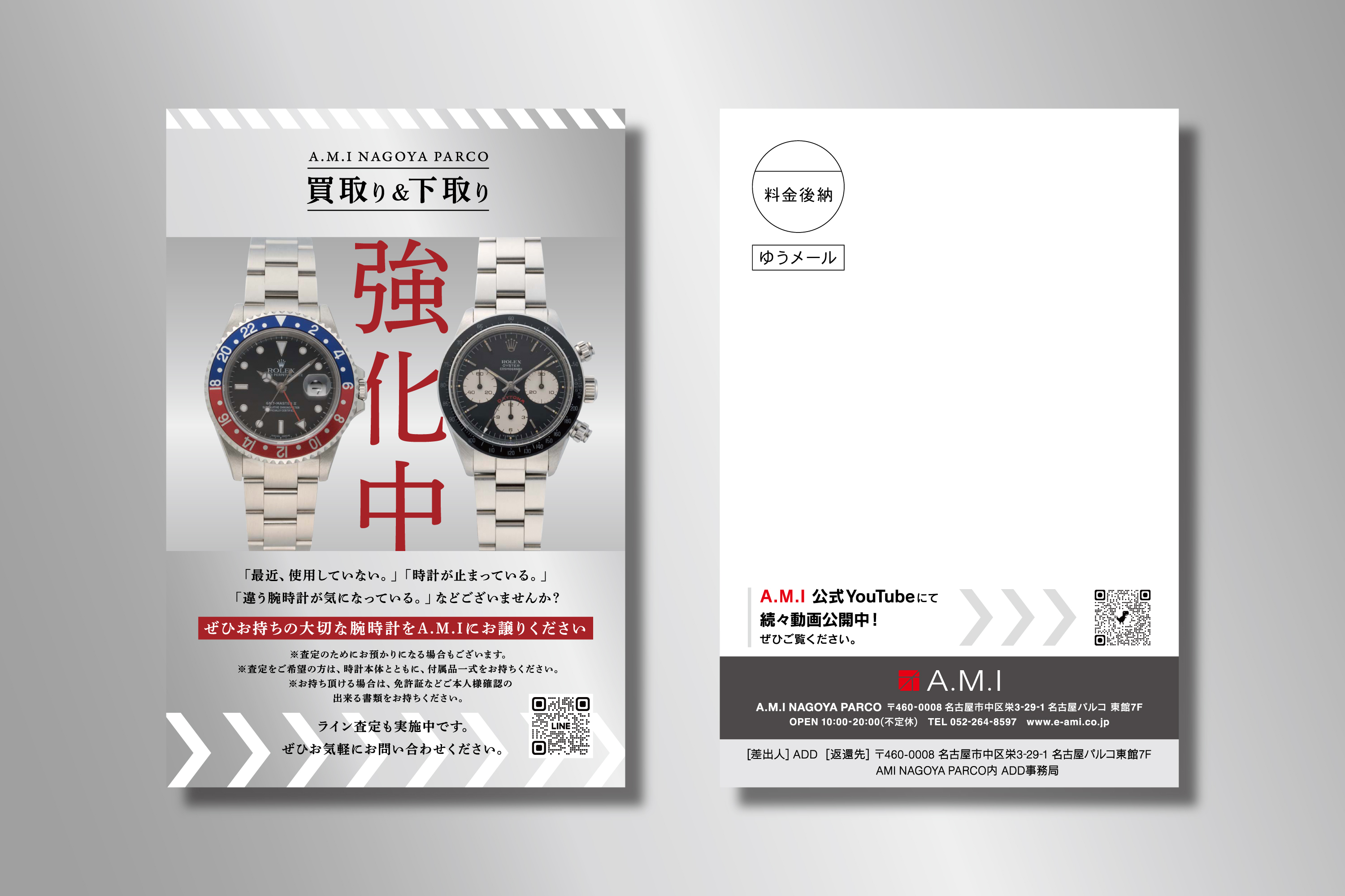A.M.I NAGOYA PARCO CL:A.M.I NAGOYA PARCO(名古屋市) DM 腕時計正規代理店 A.M.I様のDMを制作しました。光彩を帯びた背景色で文字や時計を際立たせつつ、洗練された印象のデザインに。 instagram @aminagoyaparco_watchshop HP https://www.e-ami.co.jp/