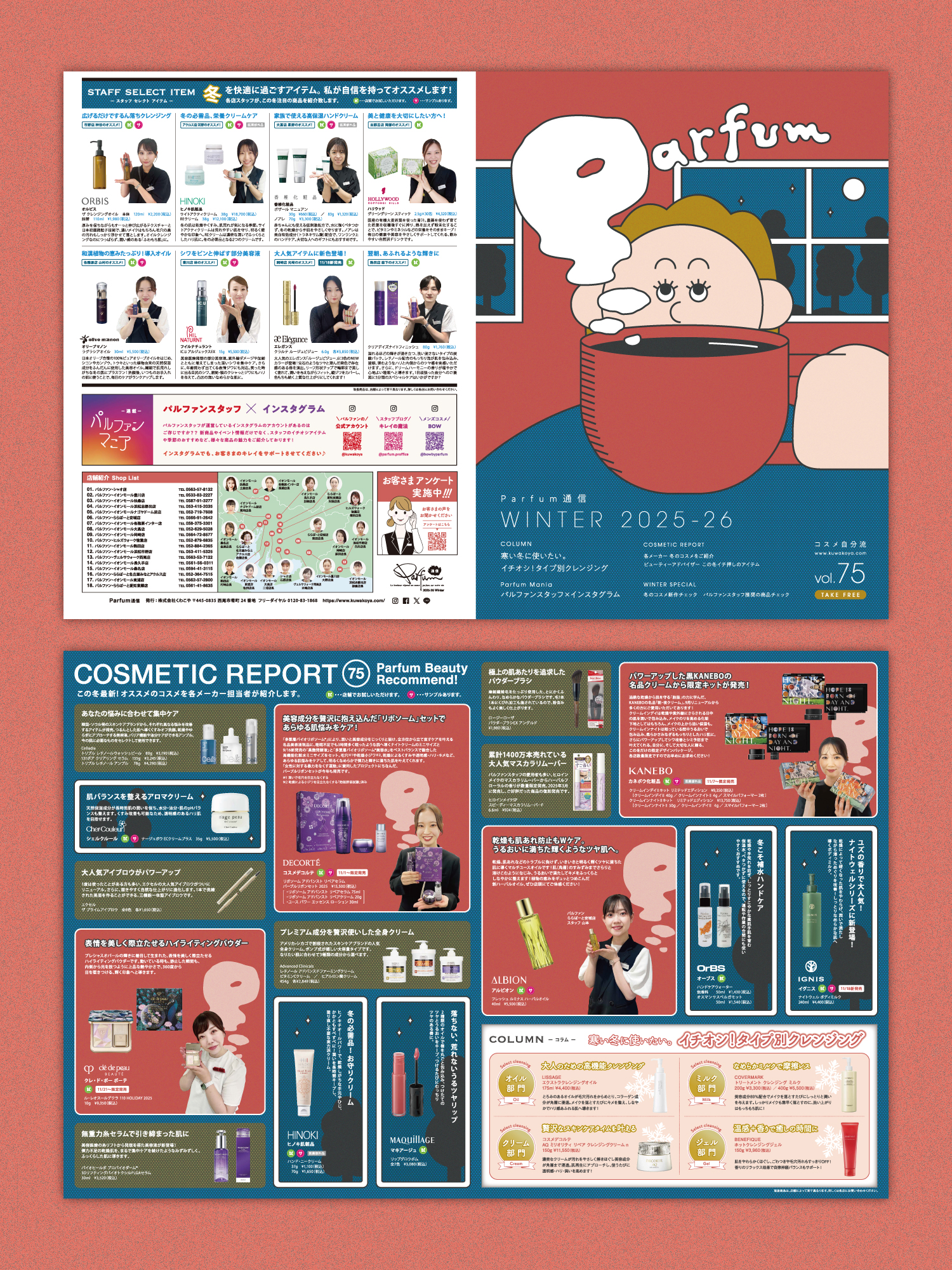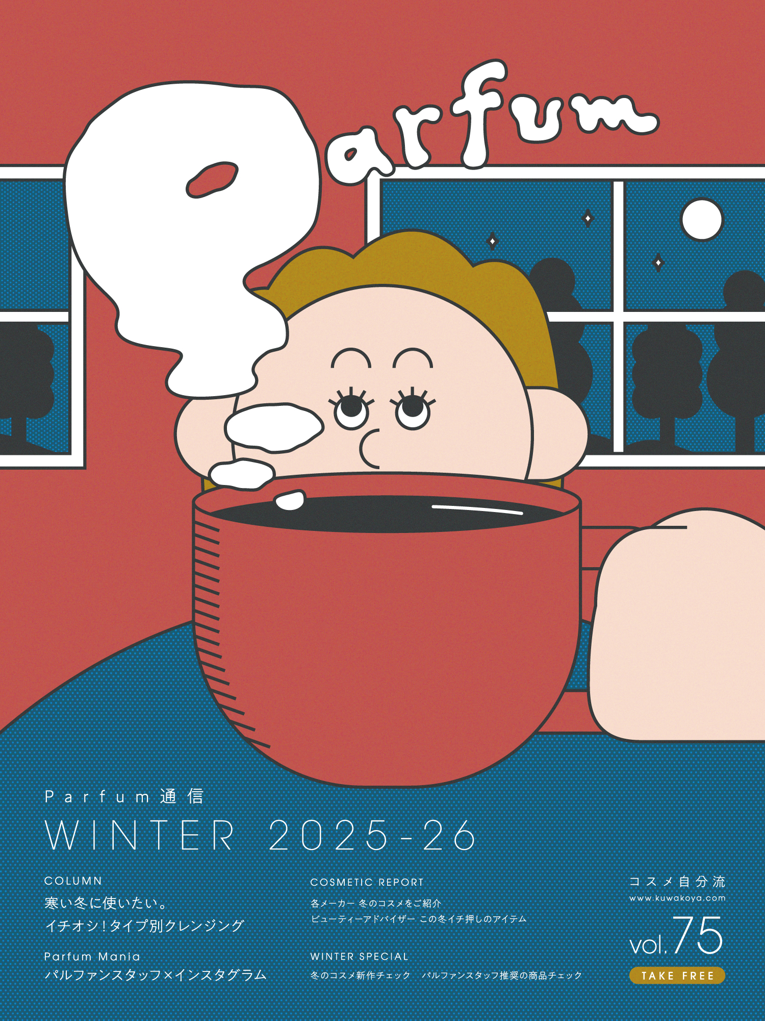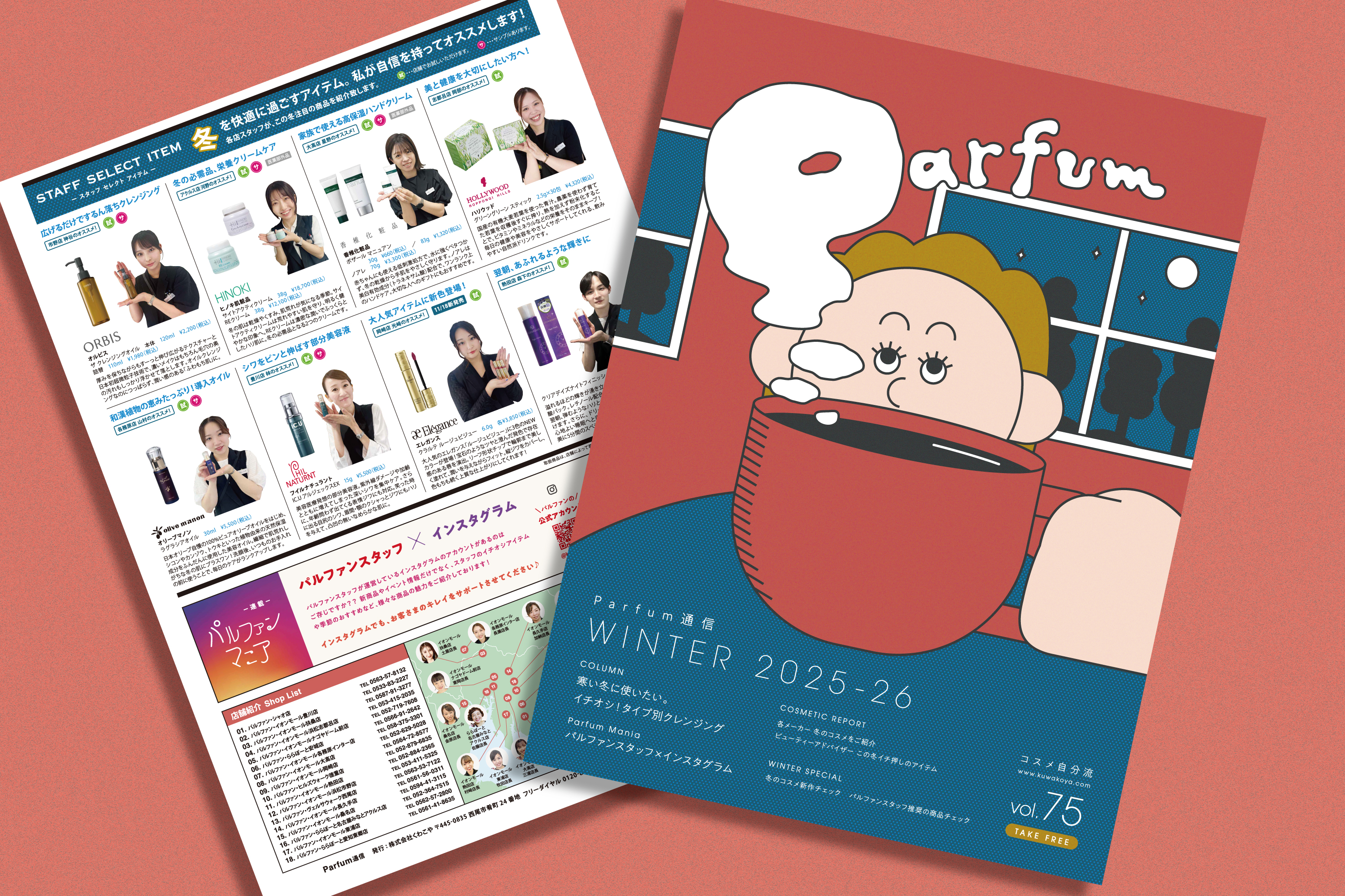 Parfum 株式会社くわこや CL:Parfum 株式会社くわこや フリーペーパー コスメ専門店 パルファンくわこや様の季刊配布用のフリーペーパーを制作しました。今回の表紙のテーマは「冬」。表紙は、寒い冬にホッとあたたまる瞬間を表現したイラスト。温かい飲み物の湯気でParfumの文字を。 仕様 B4変形4頁 instagram @kuwakoya @bowbyparfum @parfum.proffice facebook kuwakoya HP http://www.kuwakoya.com