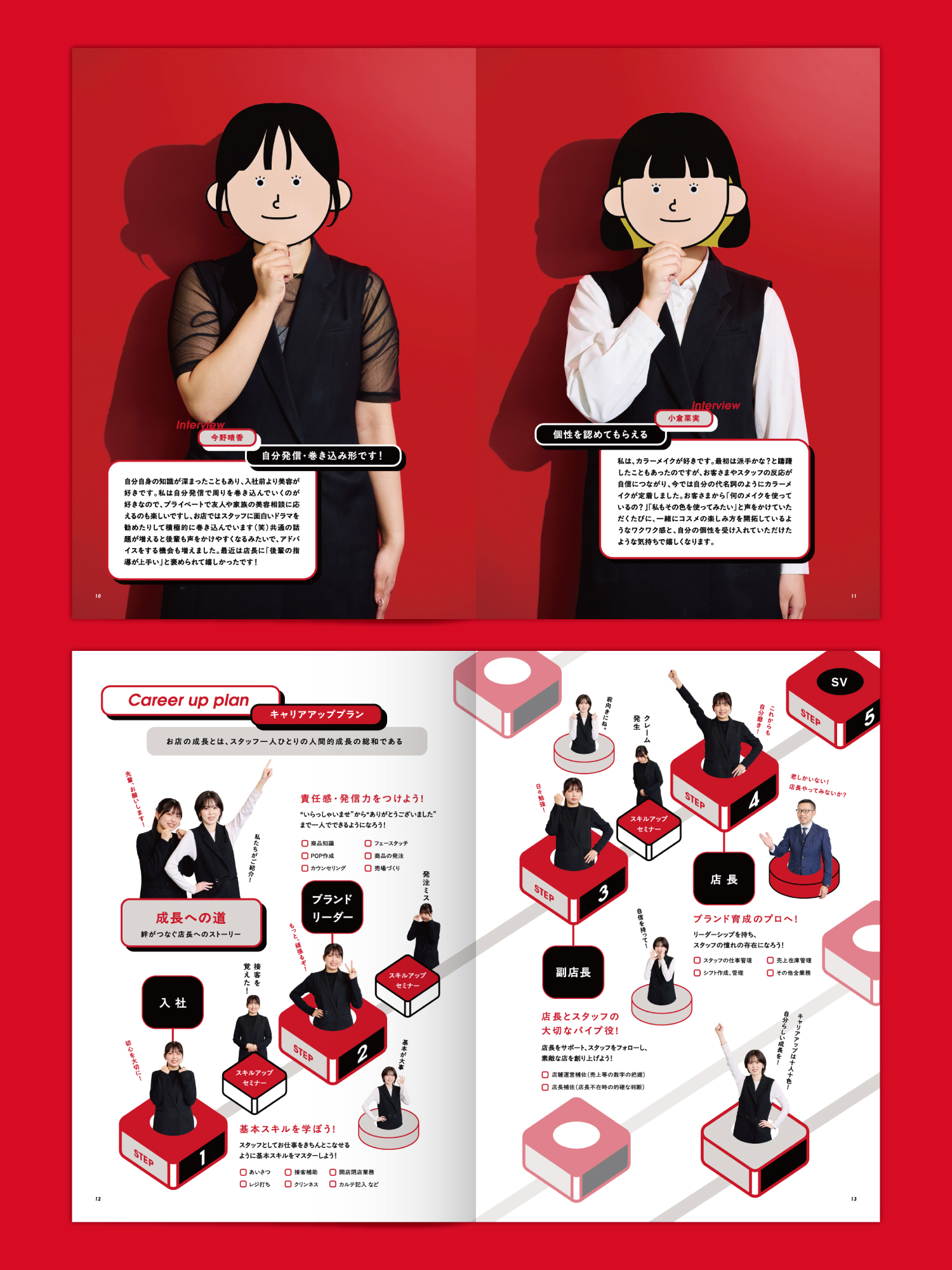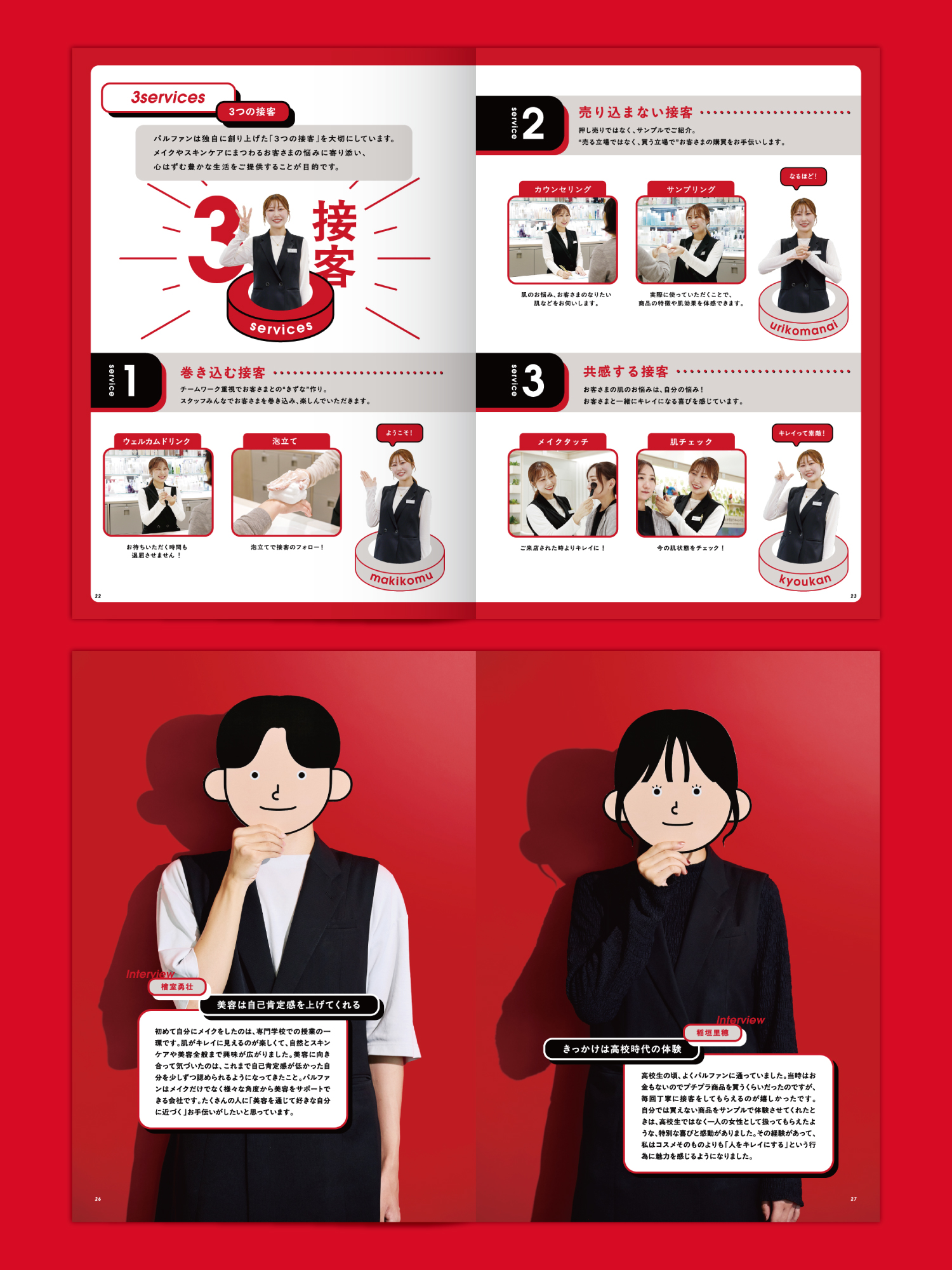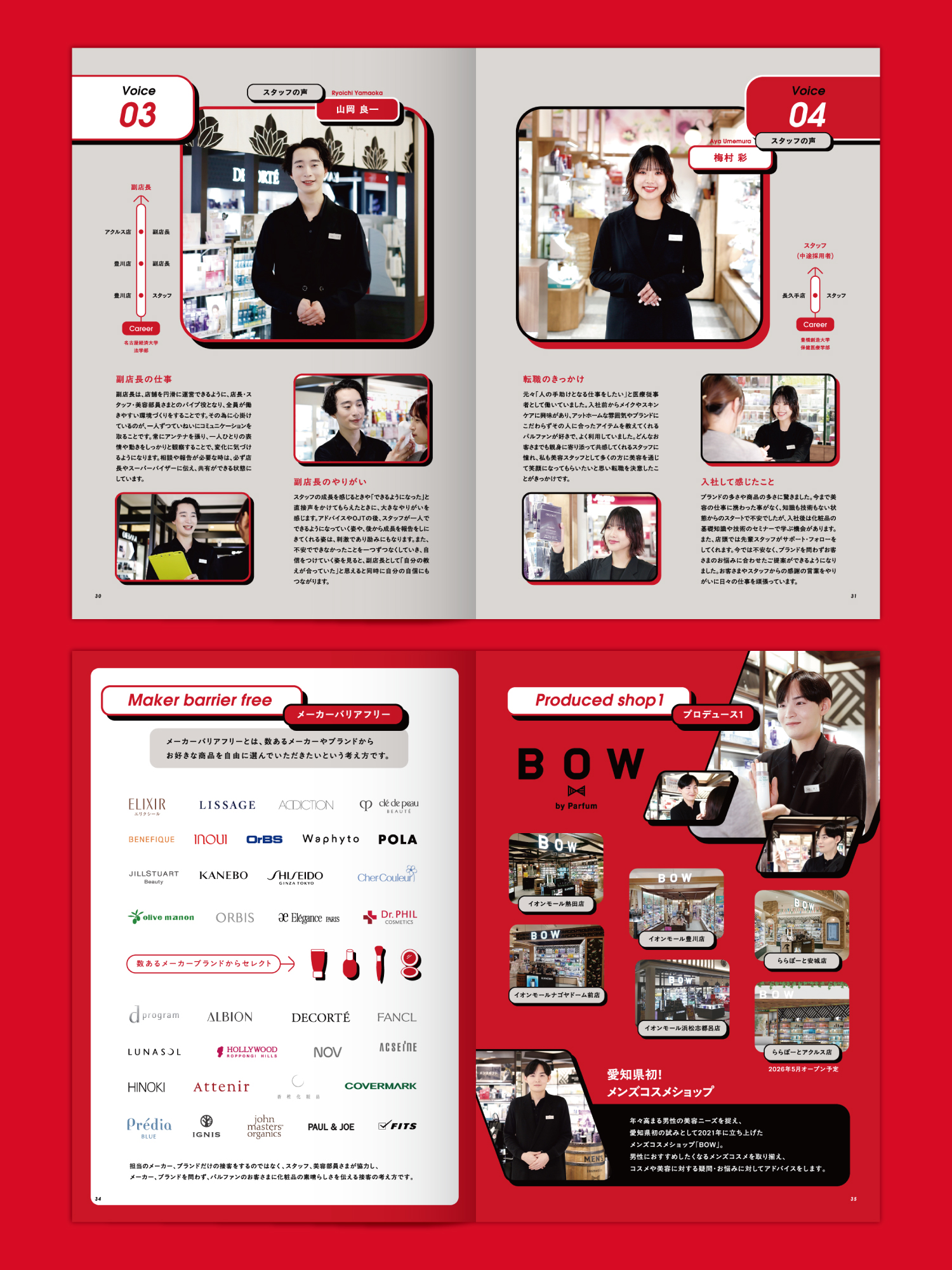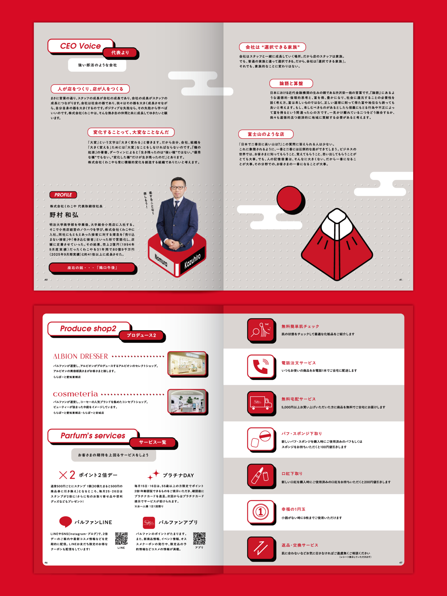 コスメ専門店 パルファンくわこや様のコーポレートガイド2026を制作しました。表紙のイラスト→扉ページのイラストお面の実写→最終頁の実写の写真へのストーリー展開を持たせることで、飾らない等身大の自分と向き合うことの大切さを訴求。インパクトのある色使いと構成で読み手を飽きさせない工夫をしています。また、インタビューページや社長×スタッフの対談ページを盛り込み、会社の雰囲気や自身の成長していく環境をイメージしやすい内容になっています。