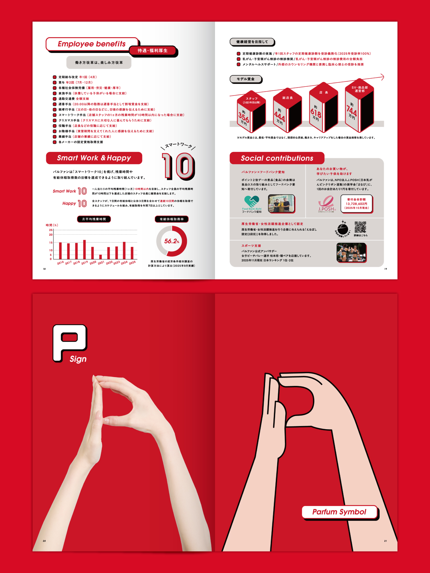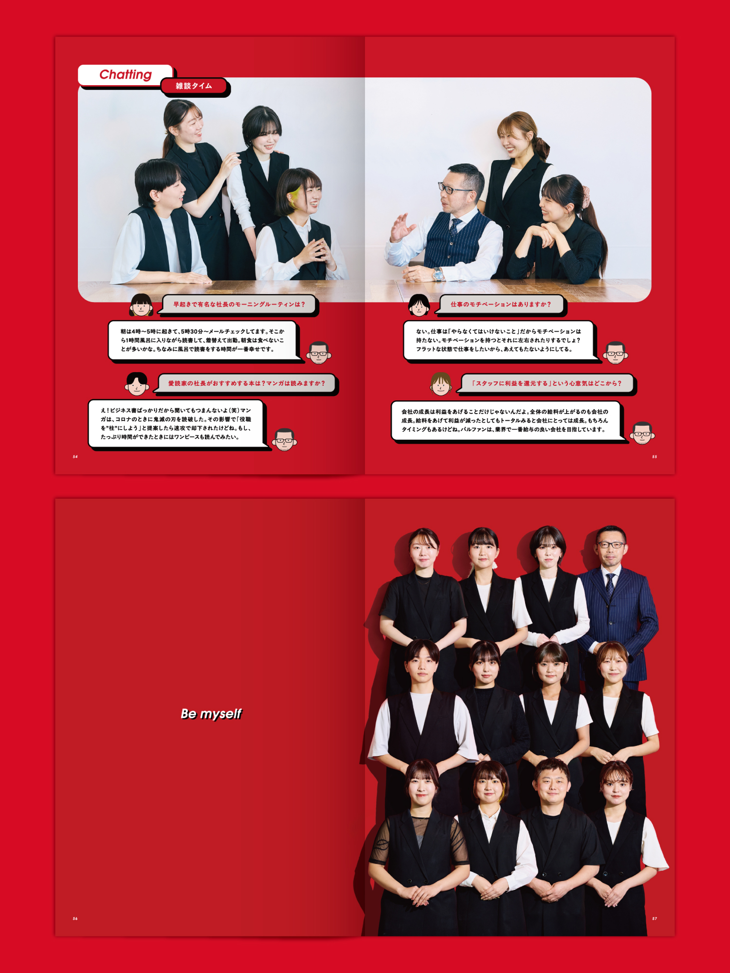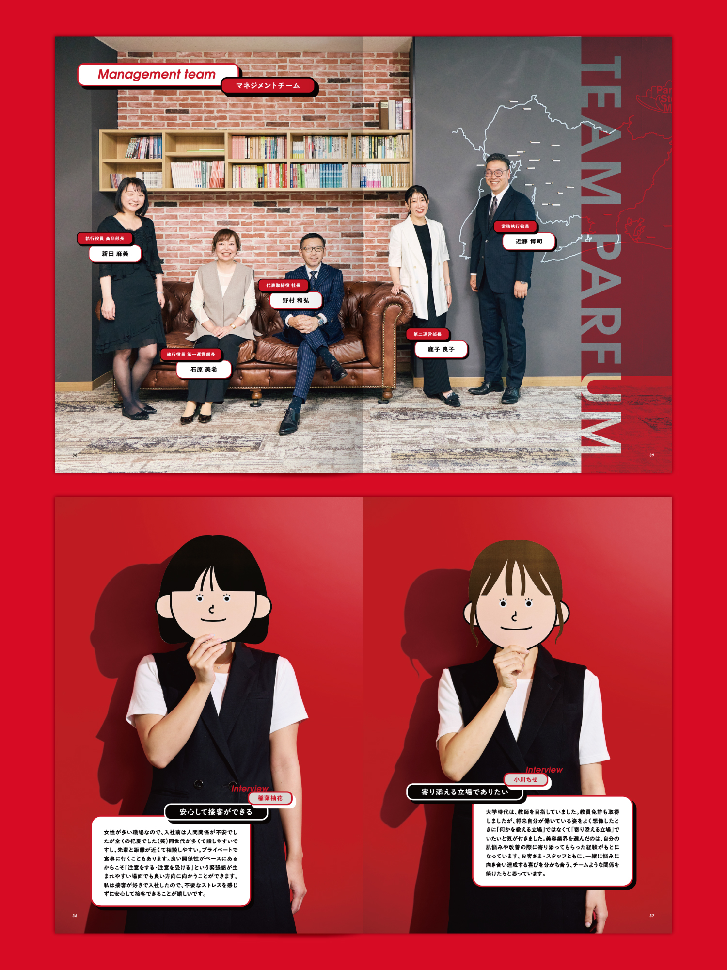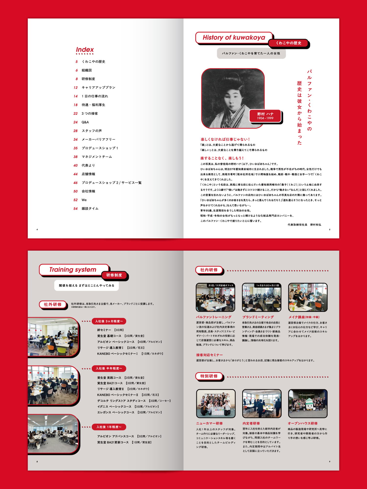 コスメ専門店 パルファンくわこや様のコーポレートガイド2026を制作しました。表紙のイラスト→扉ページのイラストお面の実写→最終頁の実写の写真へのストーリー展開を持たせることで、飾らない等身大の自分と向き合うことの大切さを訴求。インパクトのある色使いと構成で読み手を飽きさせない工夫をしています。また、インタビューページや社長×スタッフの対談ページを盛り込み、会社の雰囲気や自身の成長していく環境をイメージしやすい内容になっています。