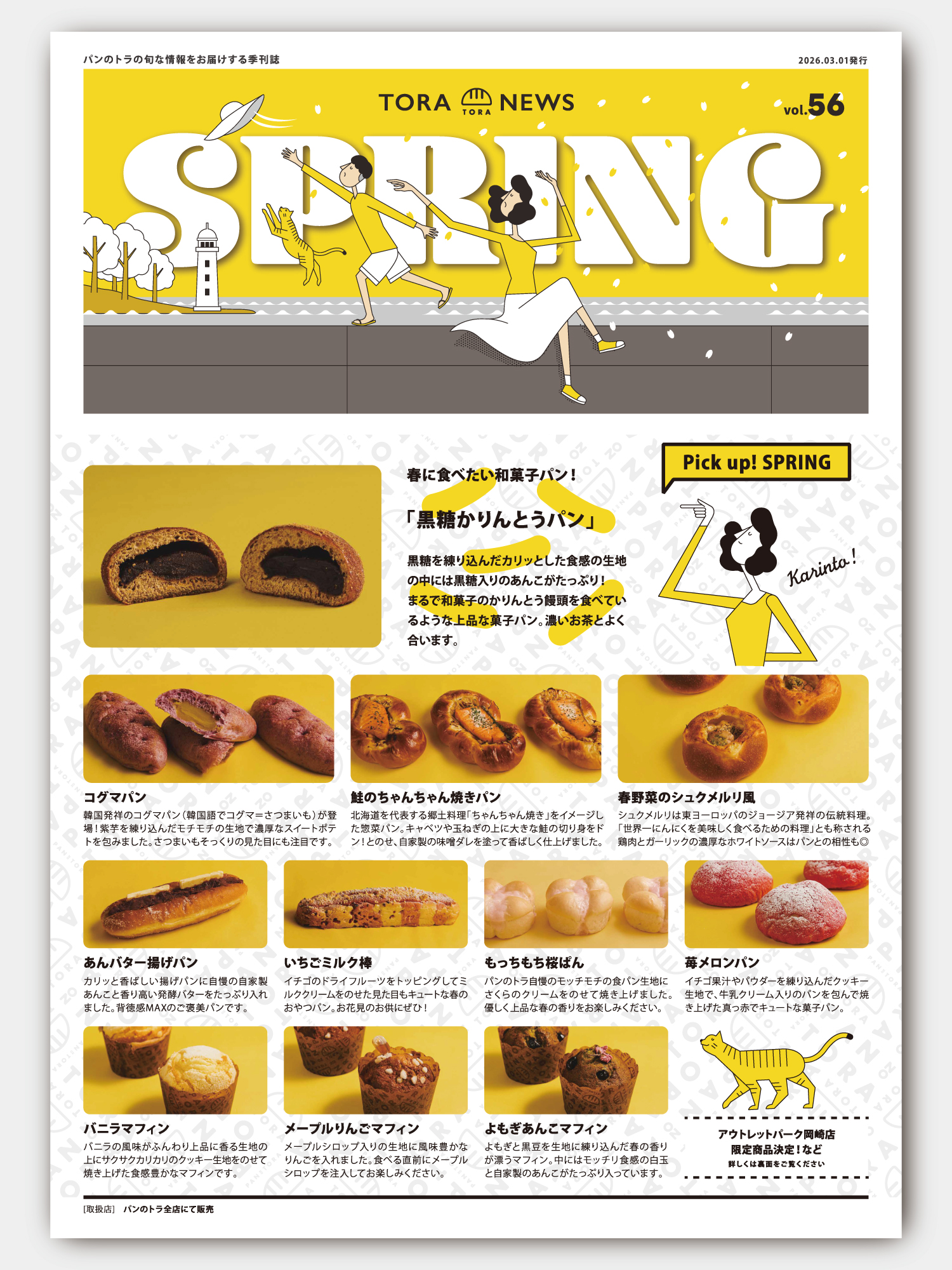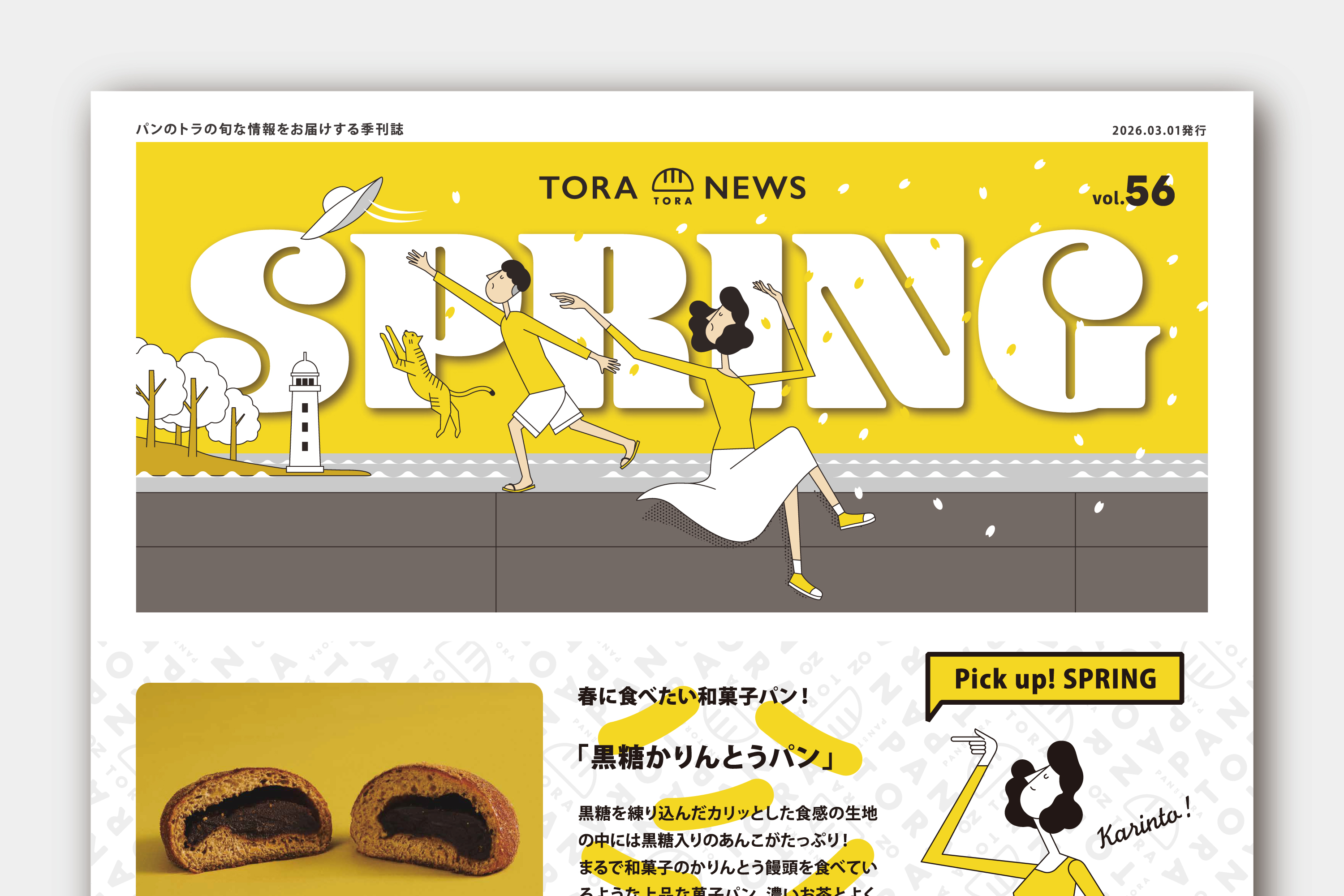パンのトラ CL:パンのトラ リーフレット パンのトラ様の季刊誌「TORA NEWS vol.56 春号」を制作しました。春を感じるトップビジュアルが印象的。各店舗で販売する新作メニューなどの情報が満載です! 仕様 B4サイズ instagram @pannotora facebook pannotora HP http://pannotora.com オンラインストア https://pannotora-shop.com/