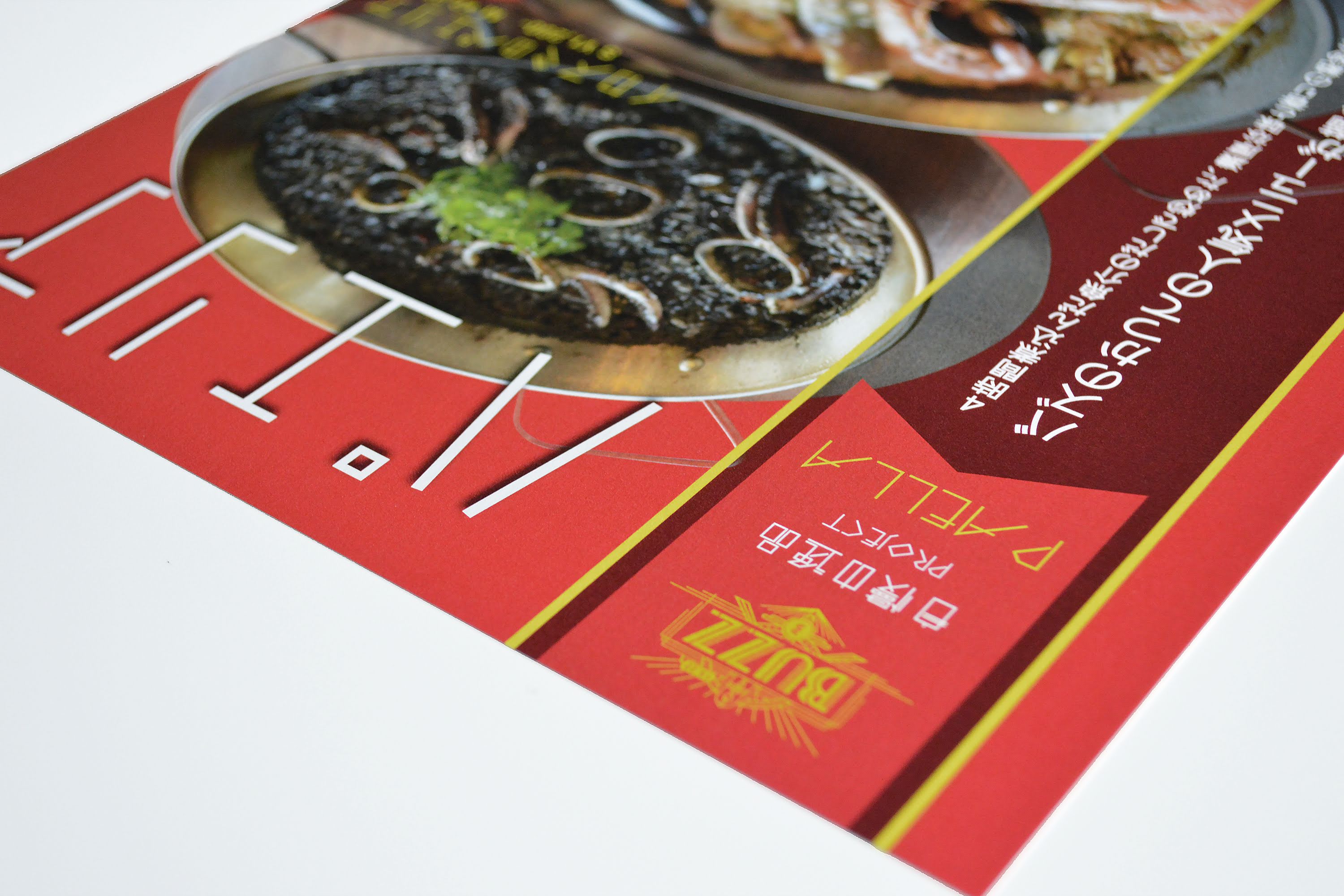 欧風バルBUZZ CL:欧風バルBUZZ メニュー表 欧風バルBUZZ様のメニュー表を制作しました。パエリアの本場、スペインの国旗の色づかいをイメージし、デザインしました。パエリアの豪快な魅力を生かしたレイアウトになっています。 BUZZのパエリア、絶品です!(試食済) ※2018年10月13日からディナーメニューに新登場! 仕様 A4変形 instagram @buzzanjo