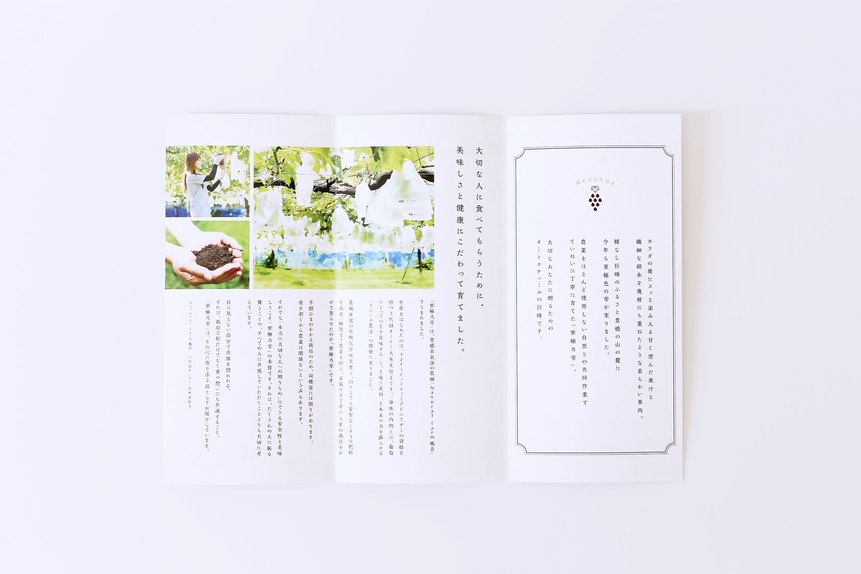 Natural Farm 風音 CL:Natural Farm 風音(豊橋市) リーフレット、商品カード 豊橋市でぶどう園を営まれるNatural Farm 風音様の贈答用リーフレットと商品カードを制作しました。巻三つ折仕様のリーフレットは、シンプルなレイアウトの中で、オーナー様の想いが伝わるコピーが生きています。また、リーフレットや商品カードに採用している深い紫色は、高級感やブランド性を印象づけています。