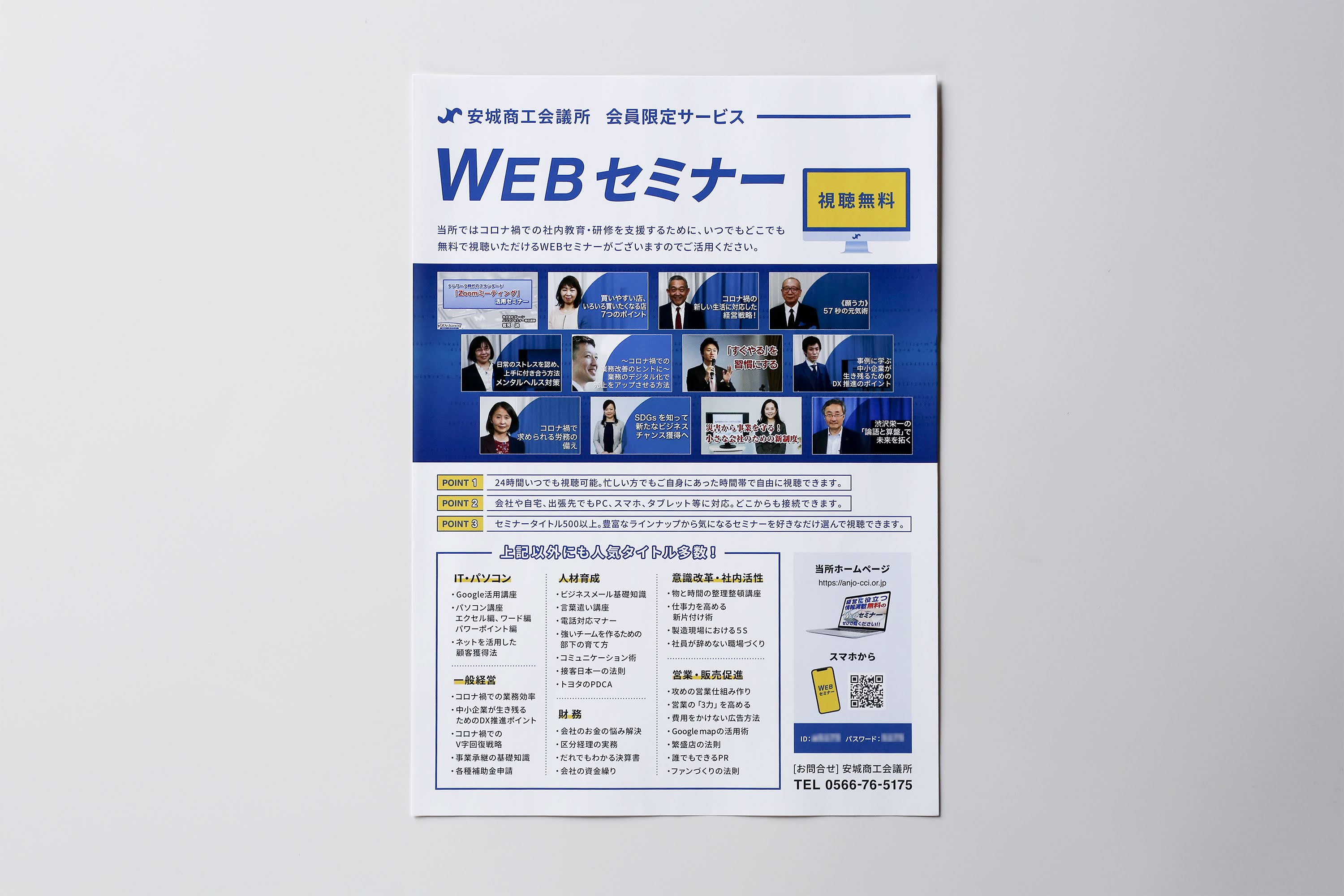 安城商工会議所 CL:安城商工会議所(安城市) チラシ 安城商工会議所様、会員限定サービス「WEBセミナー」のチラシを制作しました。情報をすっきりとまとめ、セミナーの魅力が伝わるよう見やすいレイアウトを心がけました。 仕様 A4サイズ facebook anjocci HP https://anjo-cci.or.jp/