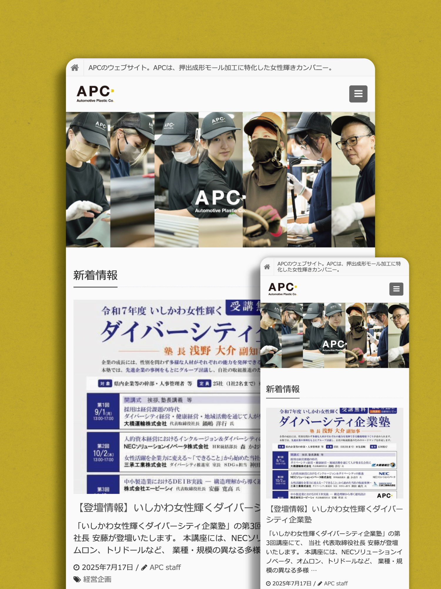 株式会社 エーピーシィ CL:株式会社 エーピーシィ(安城市) 撮影 自動車用プラスチック製外装部品の製造を行う 株式会社 エーピーシィ様の、ホームページ・企業ポスターの掲載写真、CEOのポートレートの撮影をいたしました。スタッフ様が黙々と作業をする姿を隈なく撮影。時折見せてくださる笑顔に癒されました。ポートレートはCEOらしいスーツ姿とカジュアルな服装で撮影させていただきました。 HP http://apcplus.co.jp/