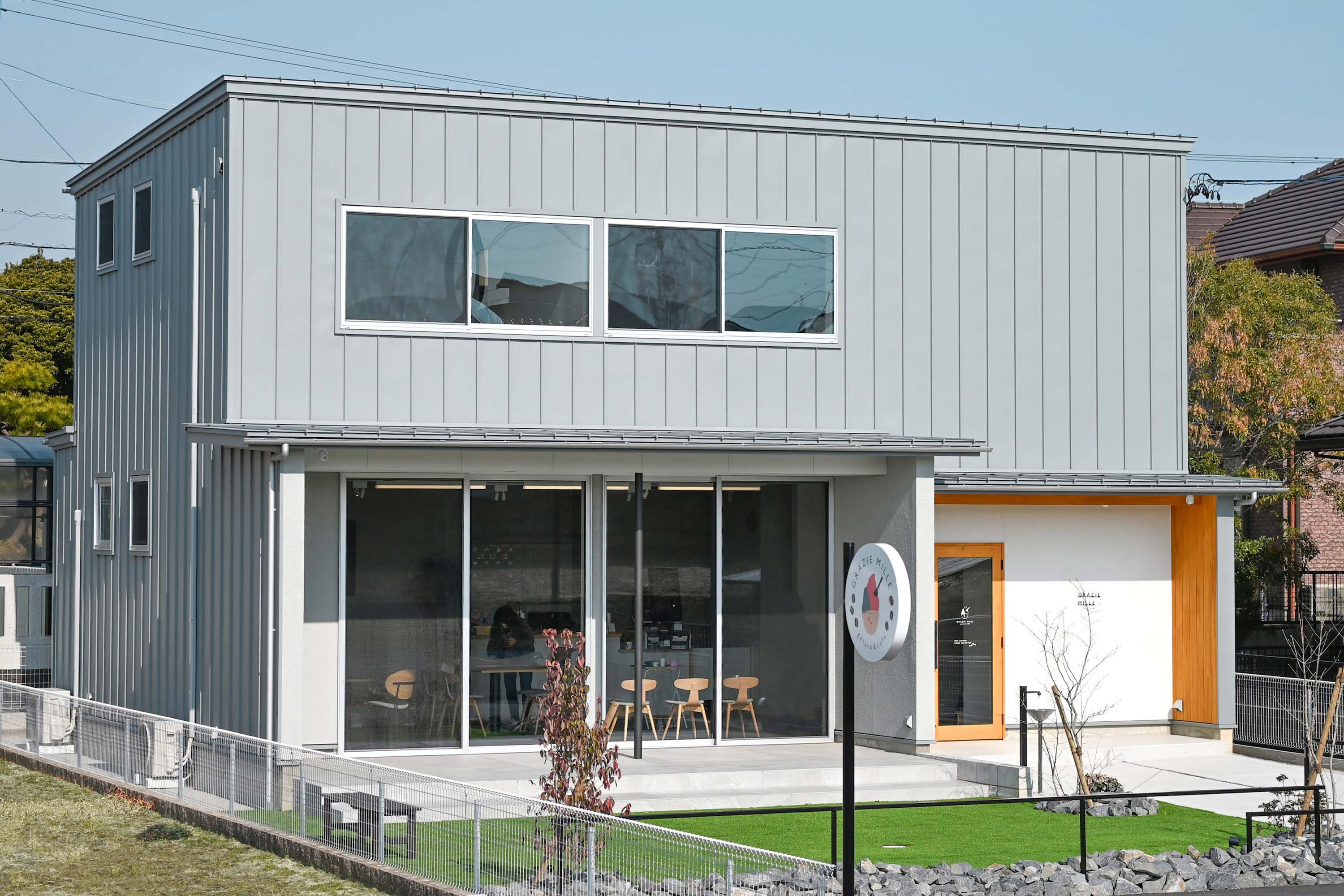外構サインはロゴを大きく見せ、お店の顔となるデザインに。表札は脚部浮き出しの切文字仕様。光が当たり綺麗な陰影が浮かび上がります。