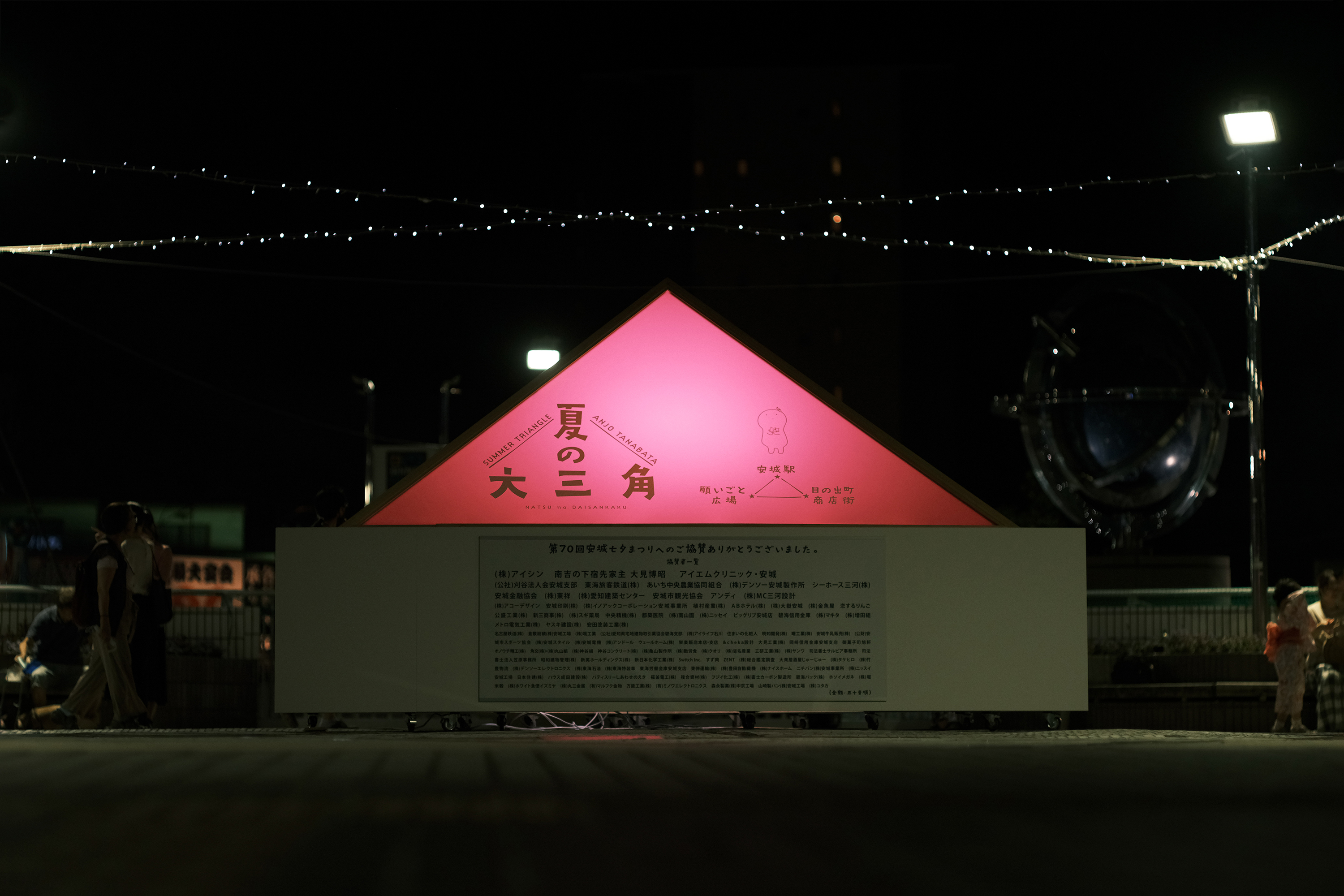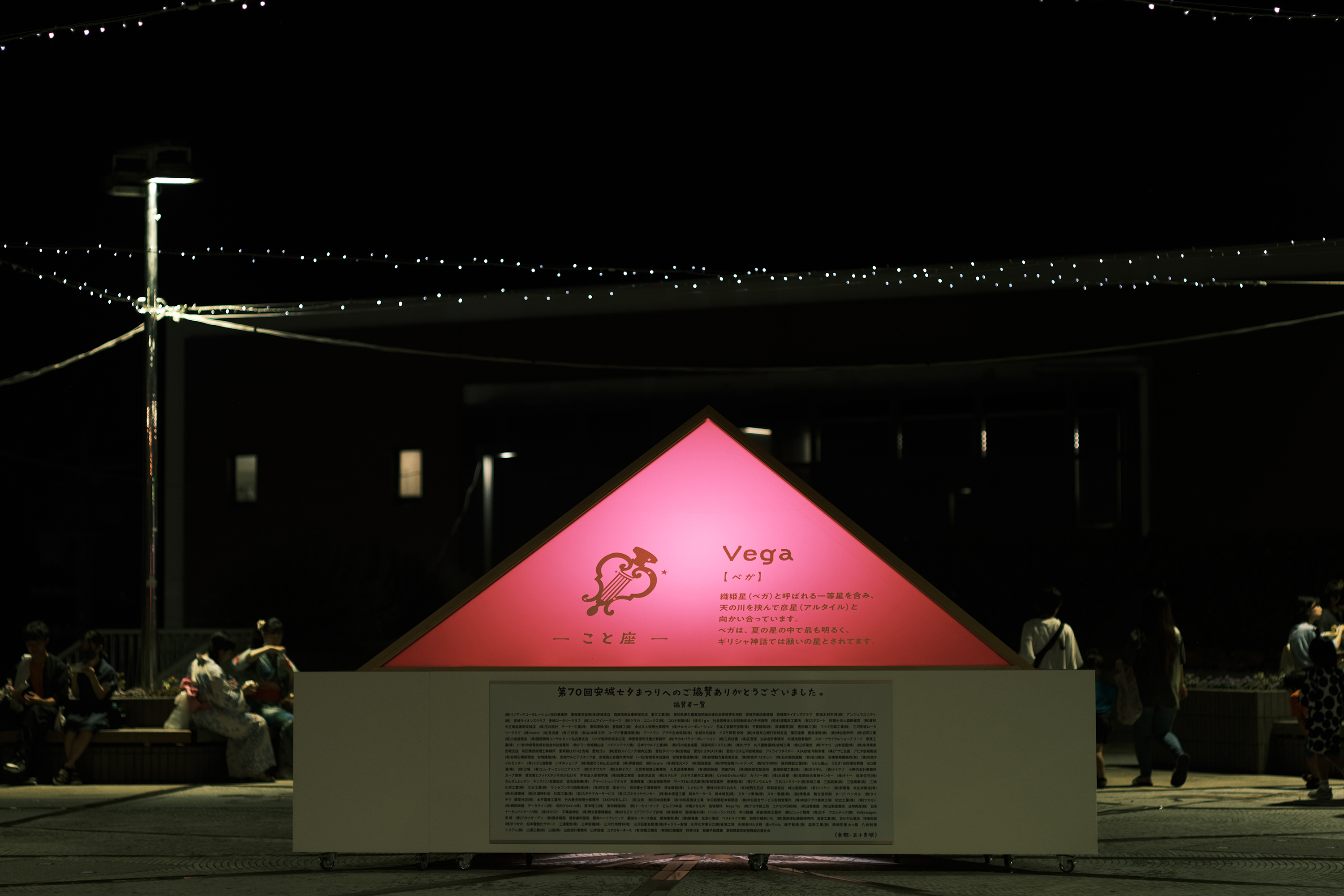 2023年8月4日〜8月6日に開催された、第70回 安城七夕まつりのモニュメントを制作しました。七夕の夜空にちなんで「夏の大三角」のこと座・わし座・はくちょう座を模したモニュメント。夜になると幻想的な灯りで側面のデザインが照らし出され、木格子に設置した電球が星図で光る演出になっています。来場者様が楽しめるよう工夫しました。