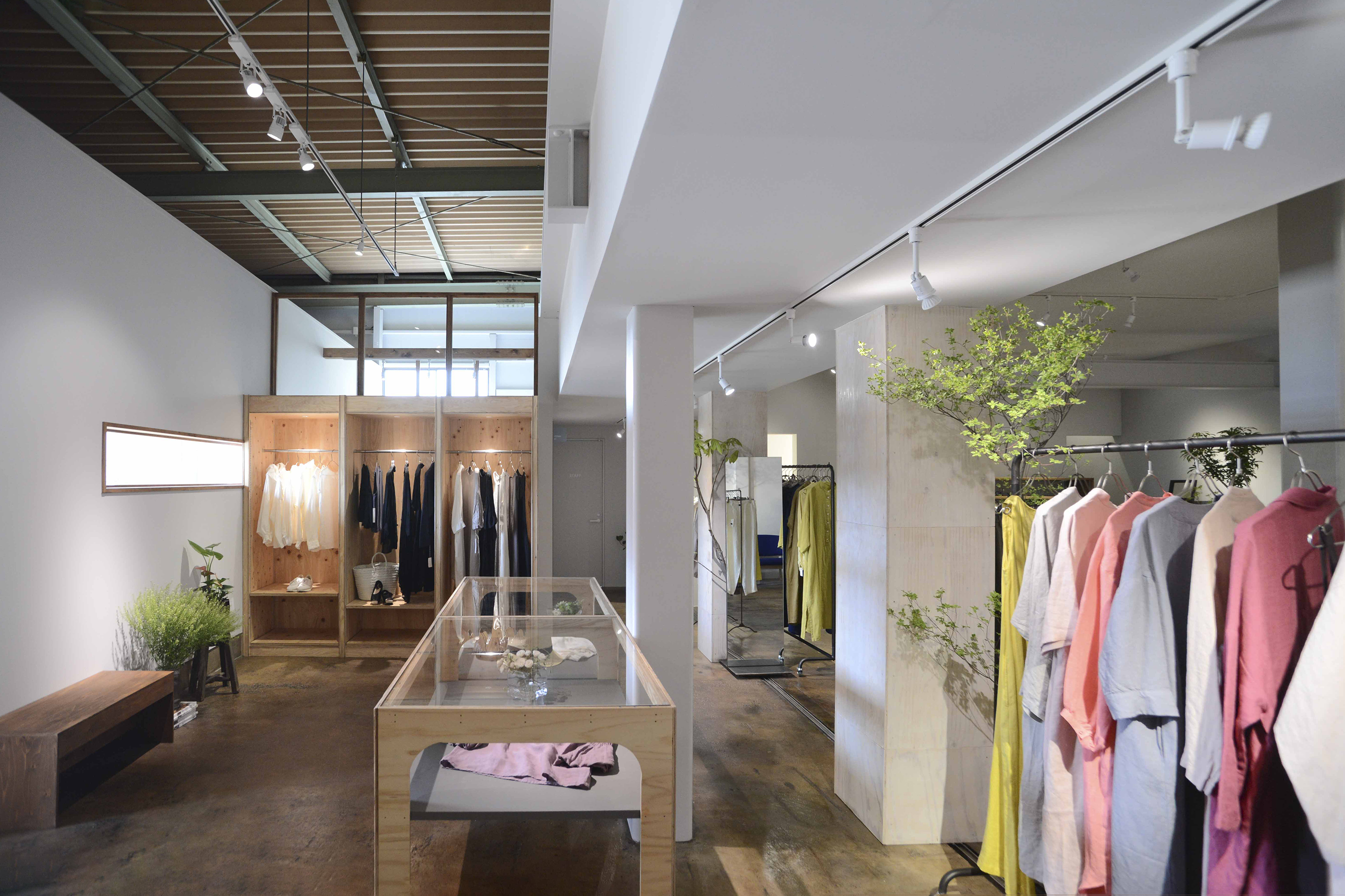 お店に入ってすぐのショップスペースにあるディスプレイテーブル。脚板がRカットになっており、真横から見るとmに見えるデザインになっています。ワードローブは製作家具により壁面ぴったりに収まり、存在感があります。上部にダウンライトを仕込むことで、収納された洋服を印象的に魅せることができます。また、カフェスペースのテーブル、カウンターなども安心感のあるシンプルなデザインでありながら実用的な工夫を凝らしています。